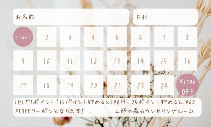 45分のカウンセリングご利用で、1回につき1ポイント付与させて頂きます。15ポイントで500円、25ポイント貯まりましたら1000円(どちらかをお選び頂けます)を、次回のカウンセリング料から割引とさせて頂きます。